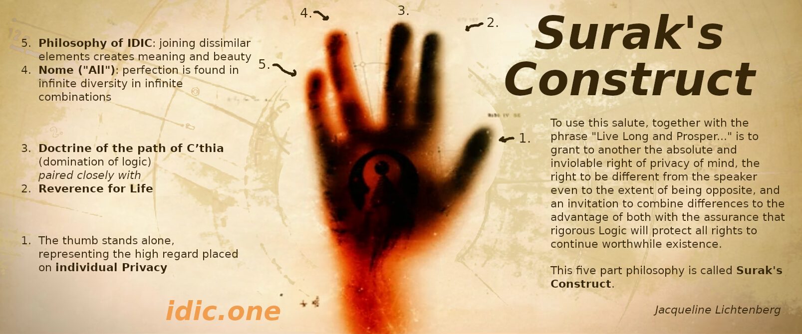 To use this salute, together with the phrase “Live Long and Prosper…” is to grant to another the absolutely inviolable right of privacy of mind, the right to be different from the speaker even to the extent of being opposite, and an invitation to combine differences to the advantage of both with assurance that rigorous Logic will protect all rights to continue worthwhile existence.